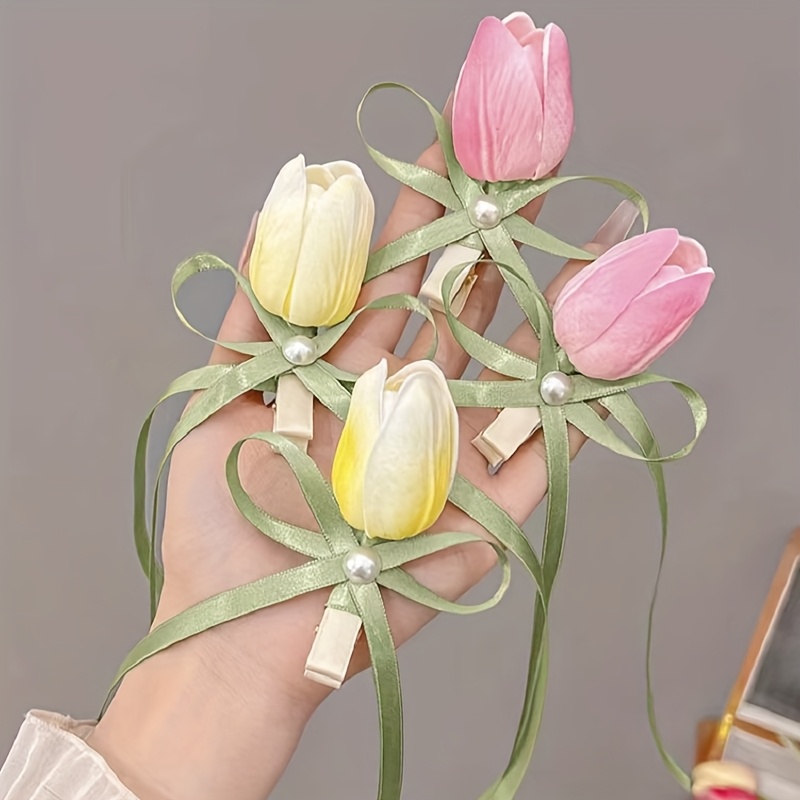 2pcs sweet tulip flowers ribbon hair clip Korean style duckbill clip imitation side clip ponytail clip fashion gift hair accessories