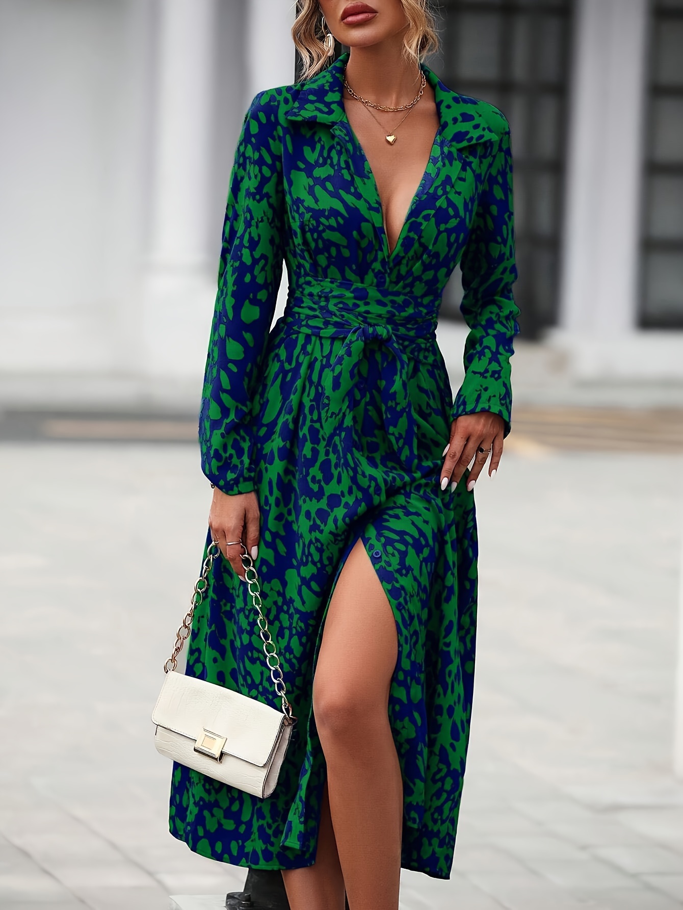 Home>Women' Fashion>Women's Dresses>Midi Dresses>Allover Print Button Front Dress, Elegant Long Sleeve Cinched Waist A-line Dress For Spring & Fall, Women's Clothing
