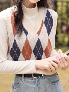 Home>Women' Fashion>Women's Tops>Sweater Vests>Argyle Print Knitted Vest, Casual Sleeveless V Neck Vintage Vest, Women's Clothing