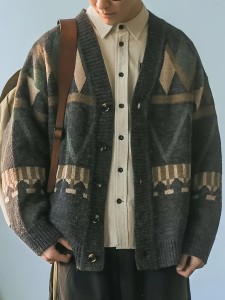 Home>Men's Fashion>Men's Sweaters & Cardigan>Classic Design Men's Spring And Autumn Ethnic Style Geometric Pattern V-neck Button Up And Long Sleeve Knit Cardigan, Varsity Style Tops For Daily Leisurewear