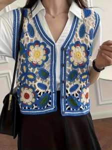 Home>Women' Fashion>Women's Tops>Sweater Vests>Color Block Button Front Cardigans Top, Vintage V Neck Geometric Pattern Embroidered Sleeveless Crop Vest For Every Day, Women's Clothing