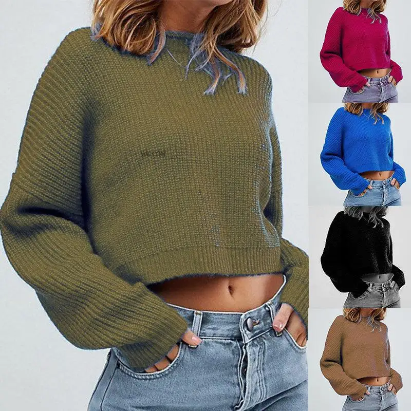 Elegant Fashion Solid Color O Neck Long Sleeve Crop Sweater Top