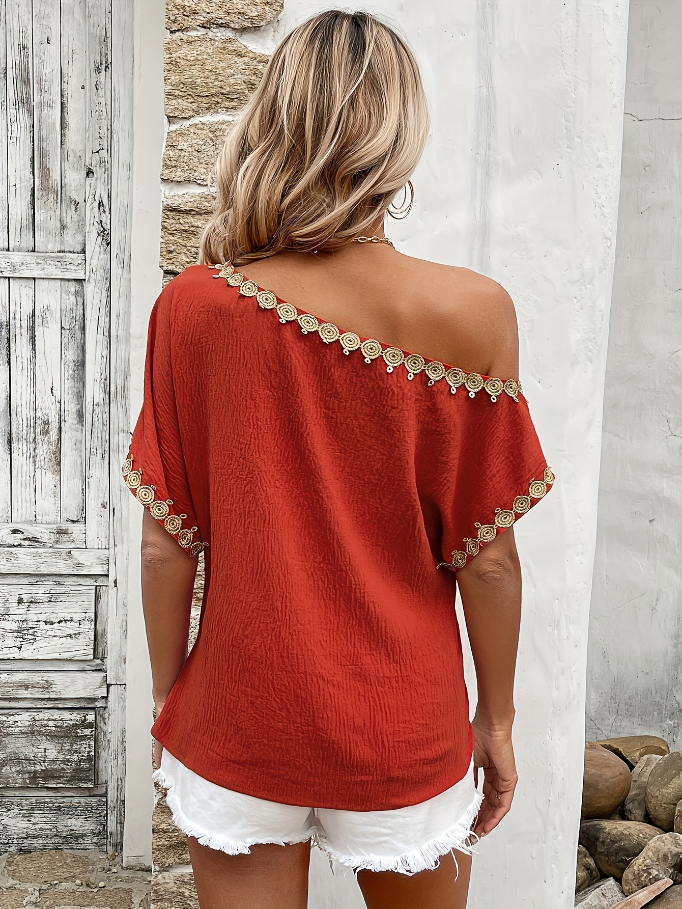 Elegant Women's Red Off-Shoulder Blouse - Stylish One-Shoulder, Golden Lace Trim, Breathable Polyester, Perfect for Spring\u002FSummer