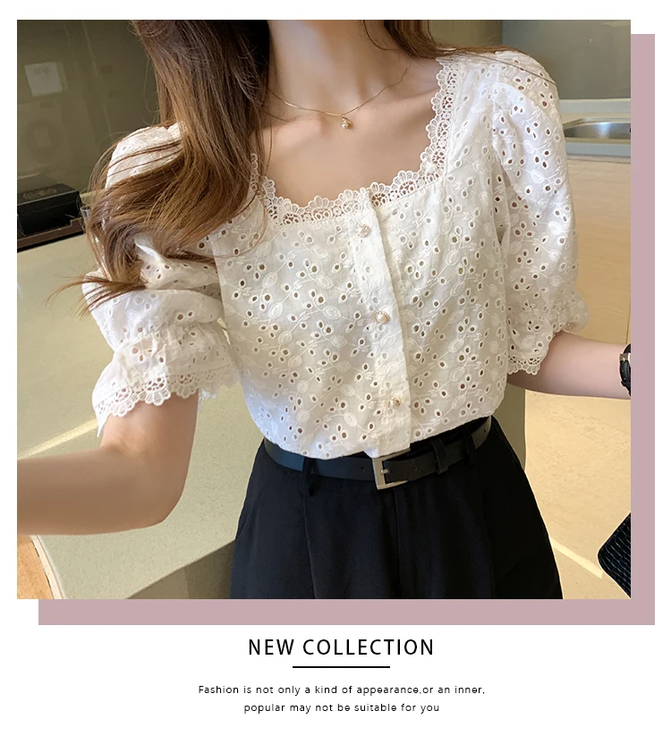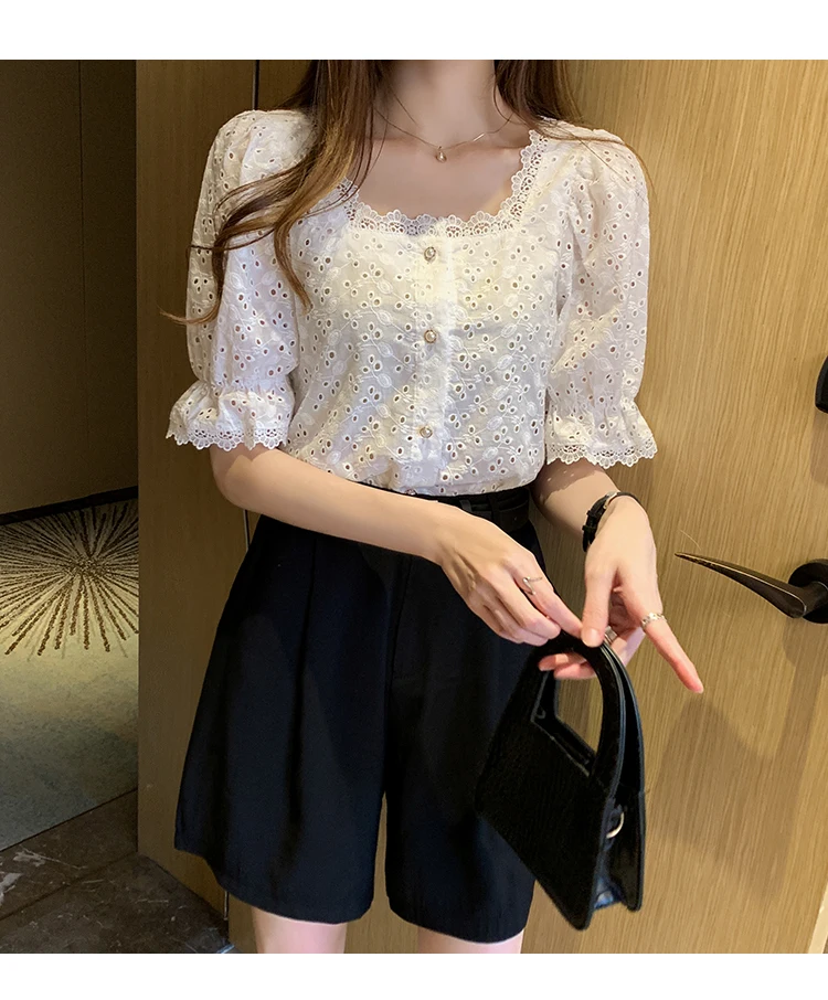 Home>Women' Fashion>Women's Tops>Blouses & Shirts>Fashion Elegant Short Sleeve Square Collar Hollow Out Blouse