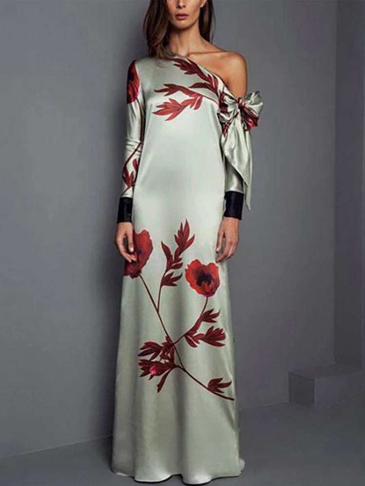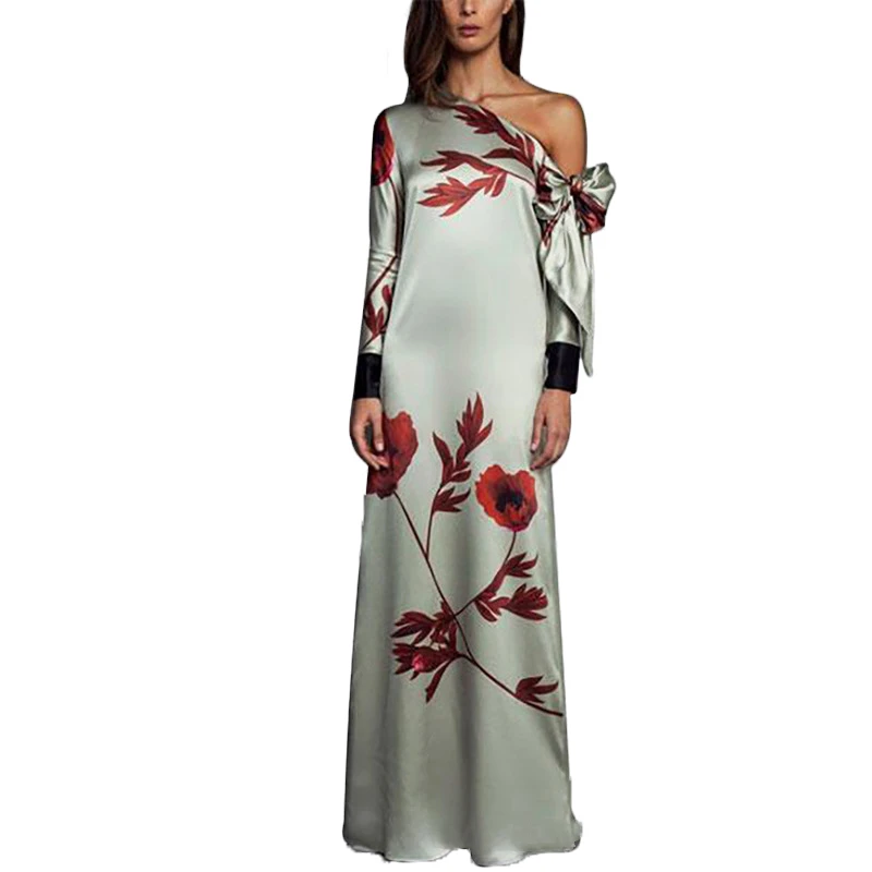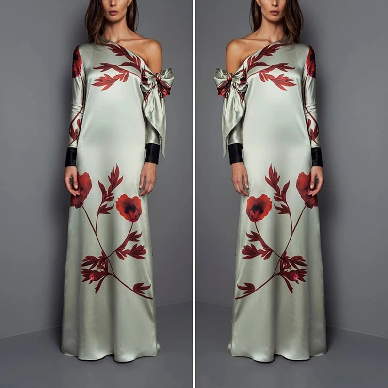 Fashion Floral Print Straight Off Shoulder Bow Casual Party Maxi Dress