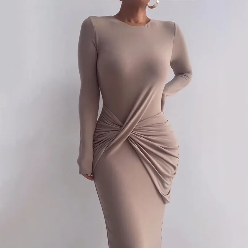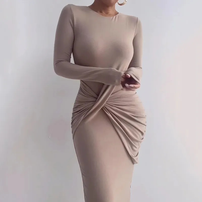 Fashion Solid Color Round Neck Long Sleeve Slim Sexy Hip Cover Bodycon Dress
