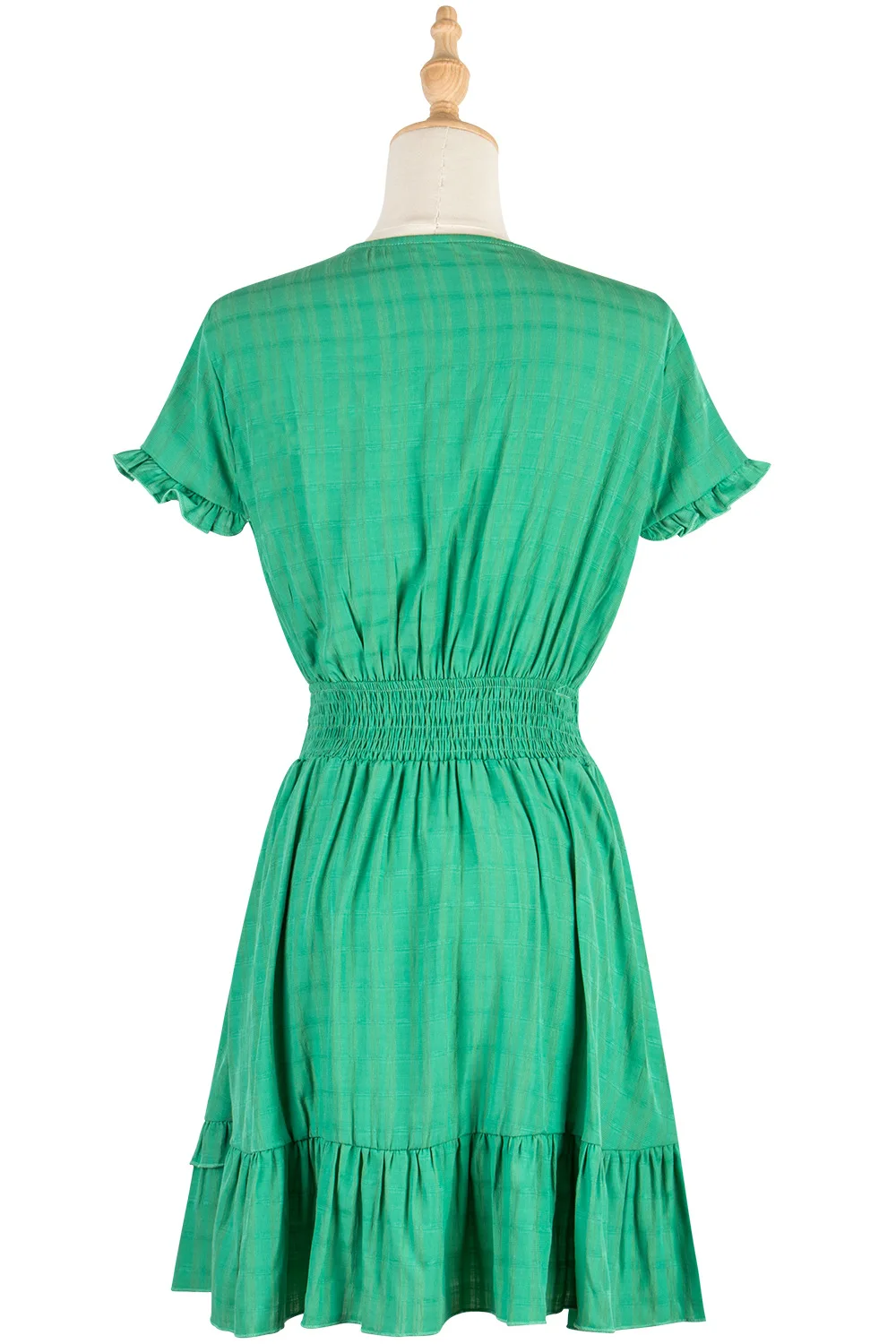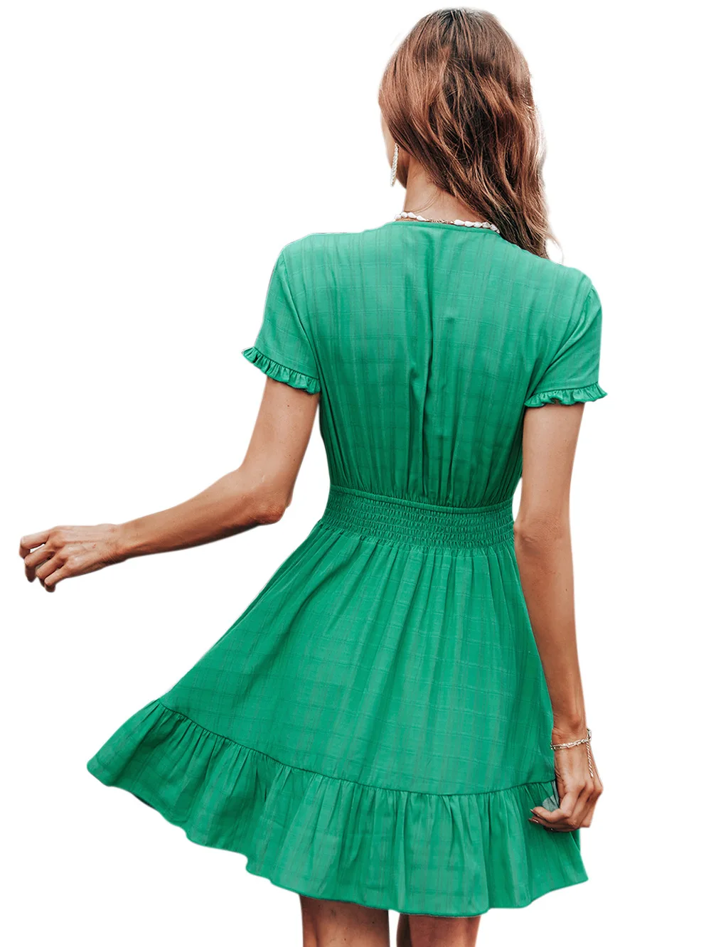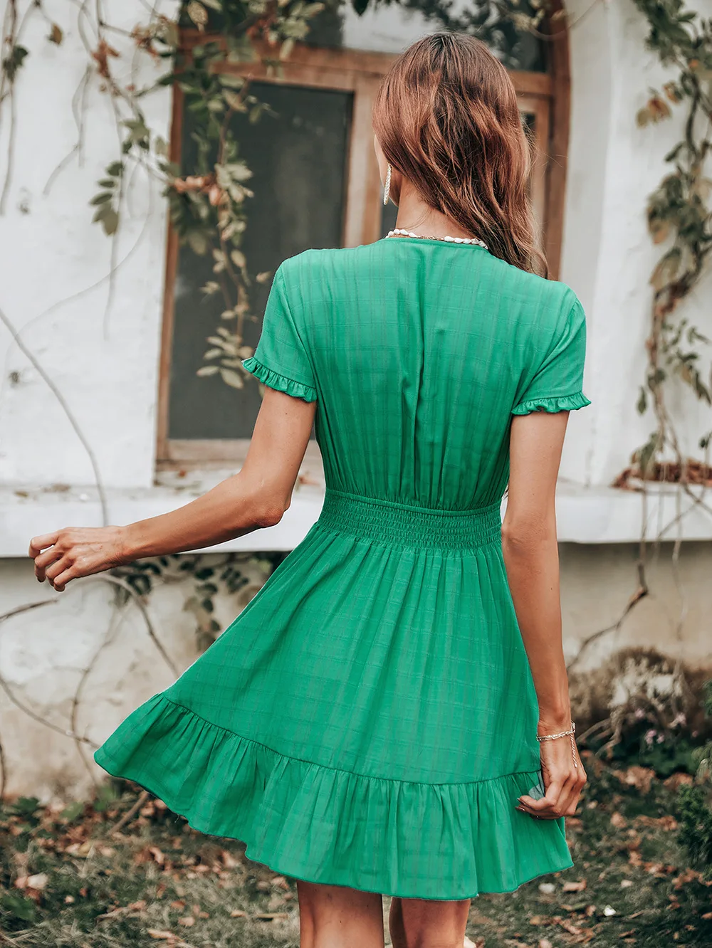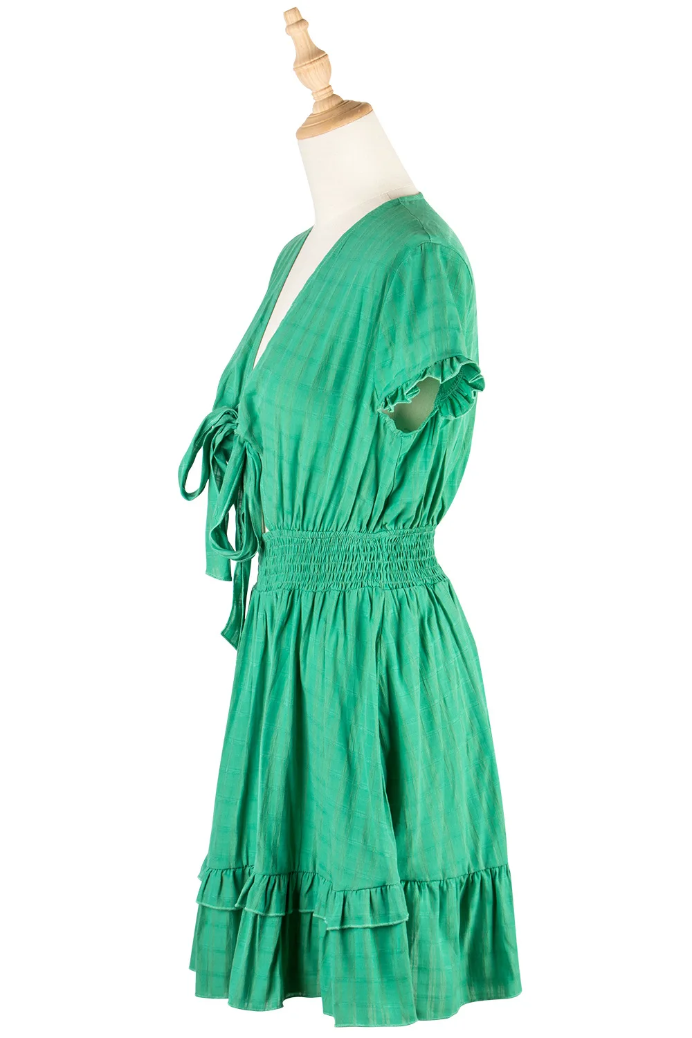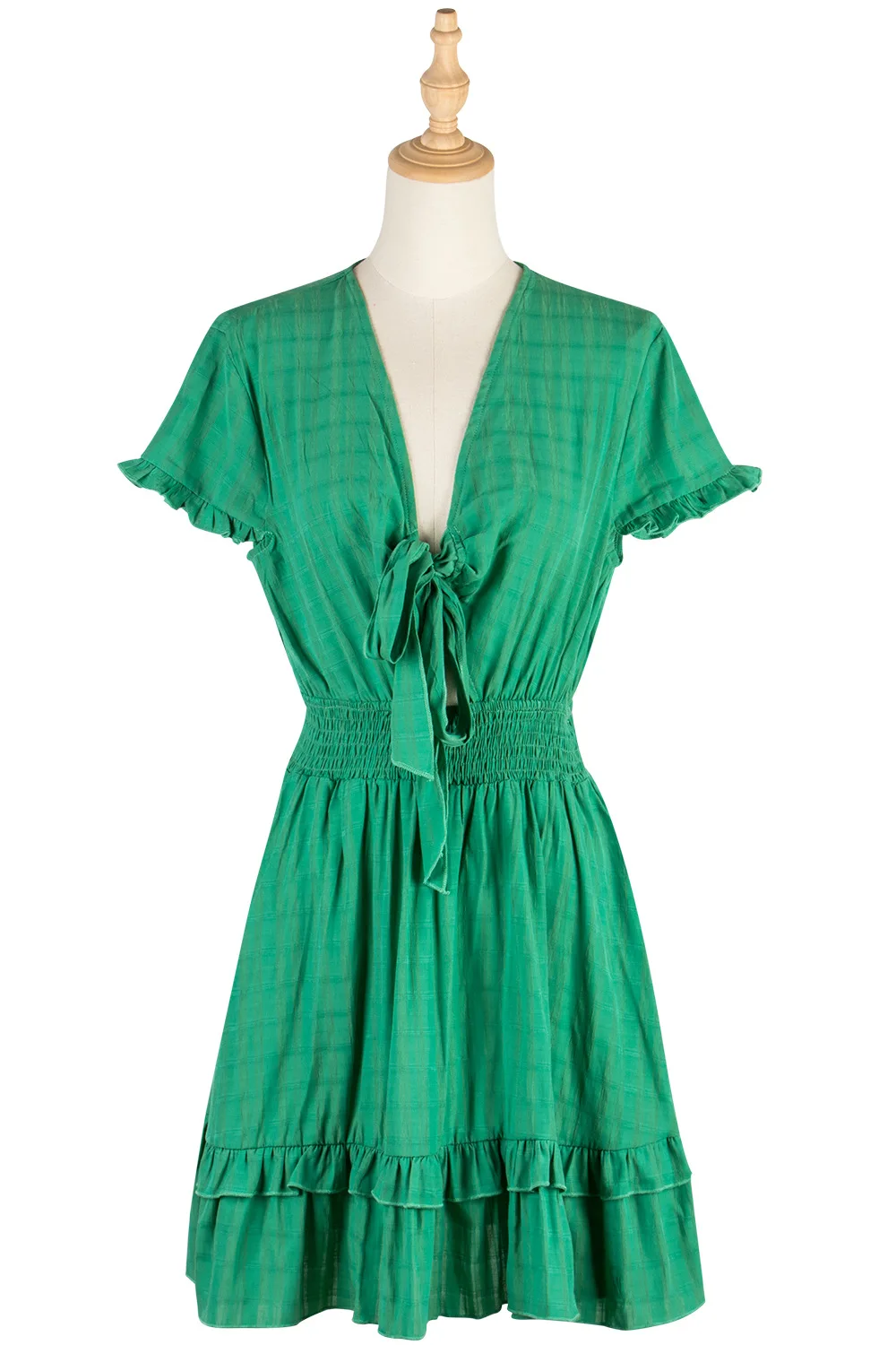 Sleek Solid V Neck Ruffle Casual Bow Tie Pleated Boho Mini Dress