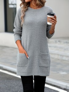 Solid Crew Neck Pullover Sweater, Casual Long Sleeve Mid Length Sweater With Pocket, Women's Clothing