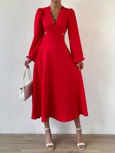 Home>Women' Fashion>Women's Dresses>Midi Dresses>Solid V Neck Cut Out Dress, Elegant Lantern Sleeve Dress, Women's Clothing