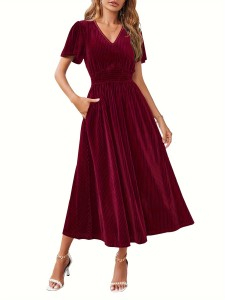 Home>Women' Fashion>Women's Dresses>Midi Dresses>Solid V-neck Cinched Waist Dress, Elegant Flutter Sleeve Ruffle Hem Dress For Party & Banquet, Women's Clothing