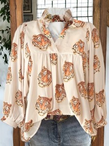 Product Name: Trendy Tiger Print Blouse - Chic Notched Neck with Flirty Ruffle Trim - Long Sleeve Casual Wear for Spring & Fall - Womens Fashion Essential