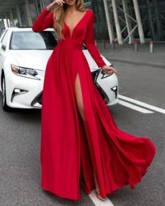 Home>Women' Fashion>Women's Dresses>Maxi Dresses>V-Neck Solid Color Long Sleevethe Sides Split Maxi Dress