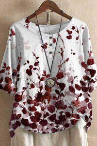 Vintage Print Loose Casual Button Elegant Half Sleeve O Neck  Blouses