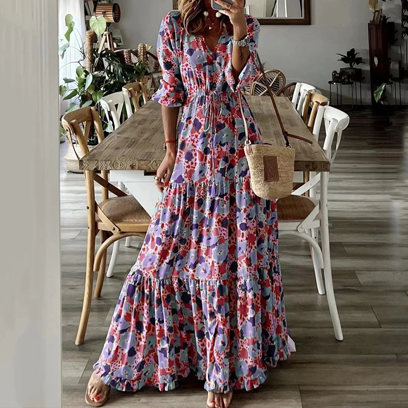 Home>Women' Fashion>Women's Dresses>Maxi Dresses>Women Floral Print Casual V-Neck Half Sleeve Loose Vintage Bohemian Beach Maxi Dress