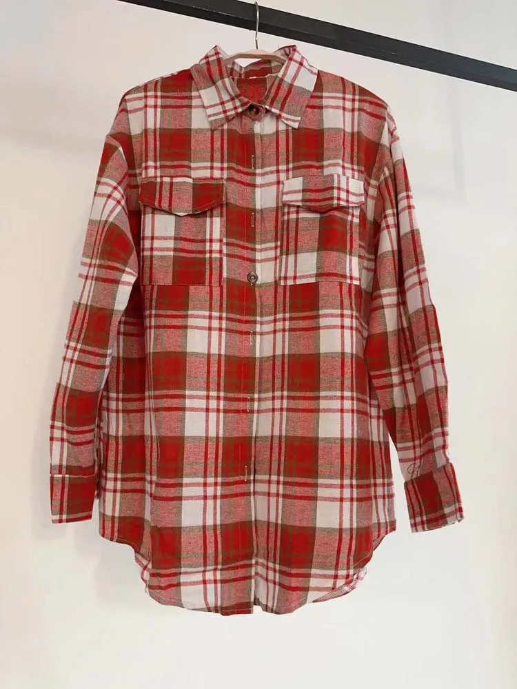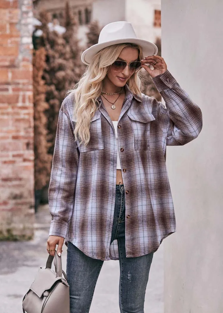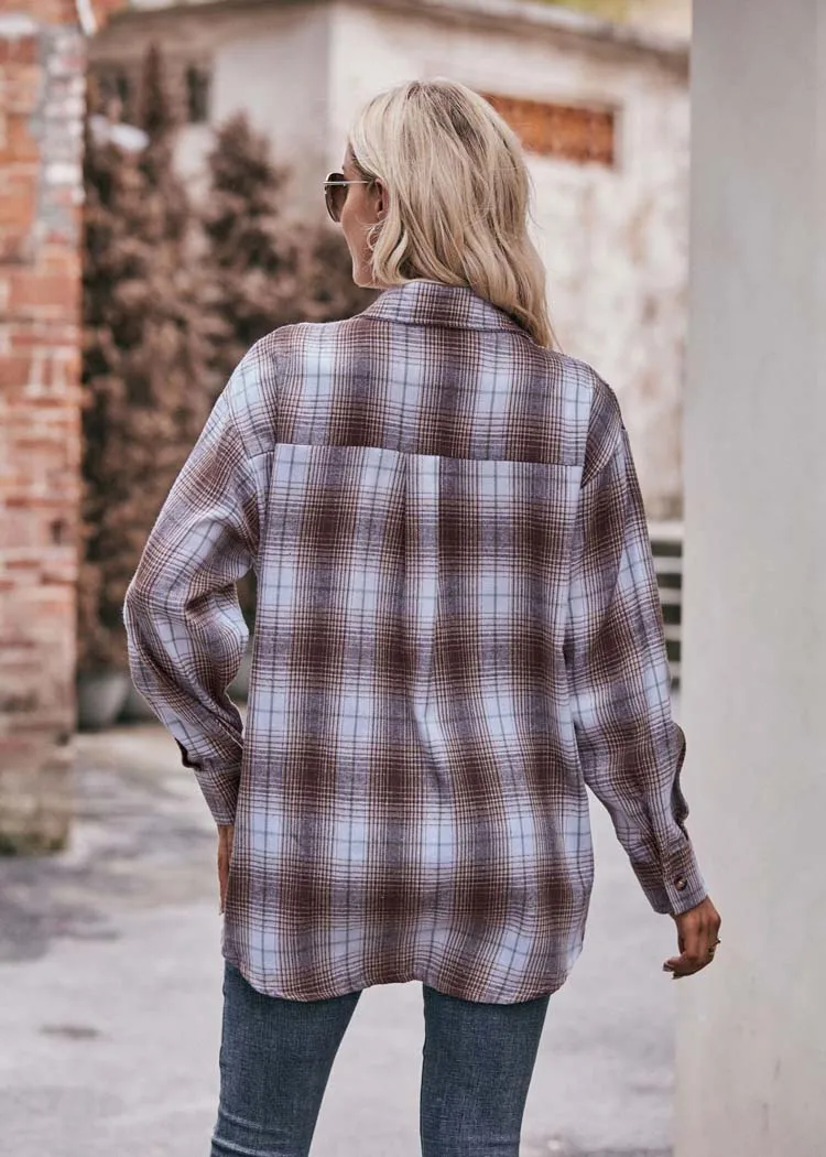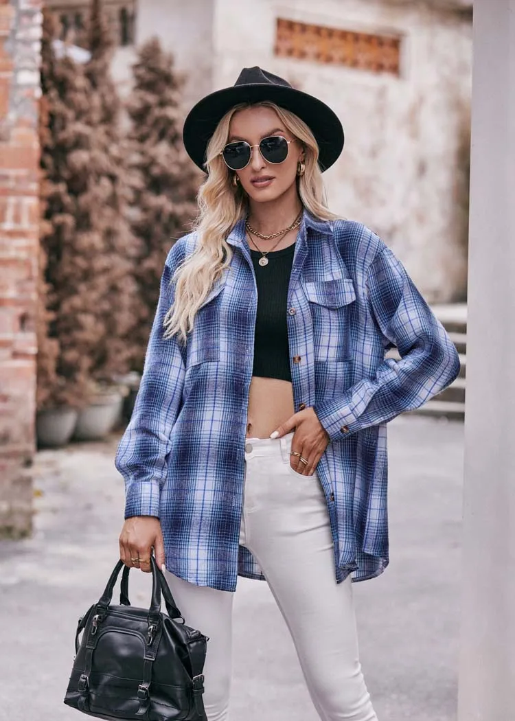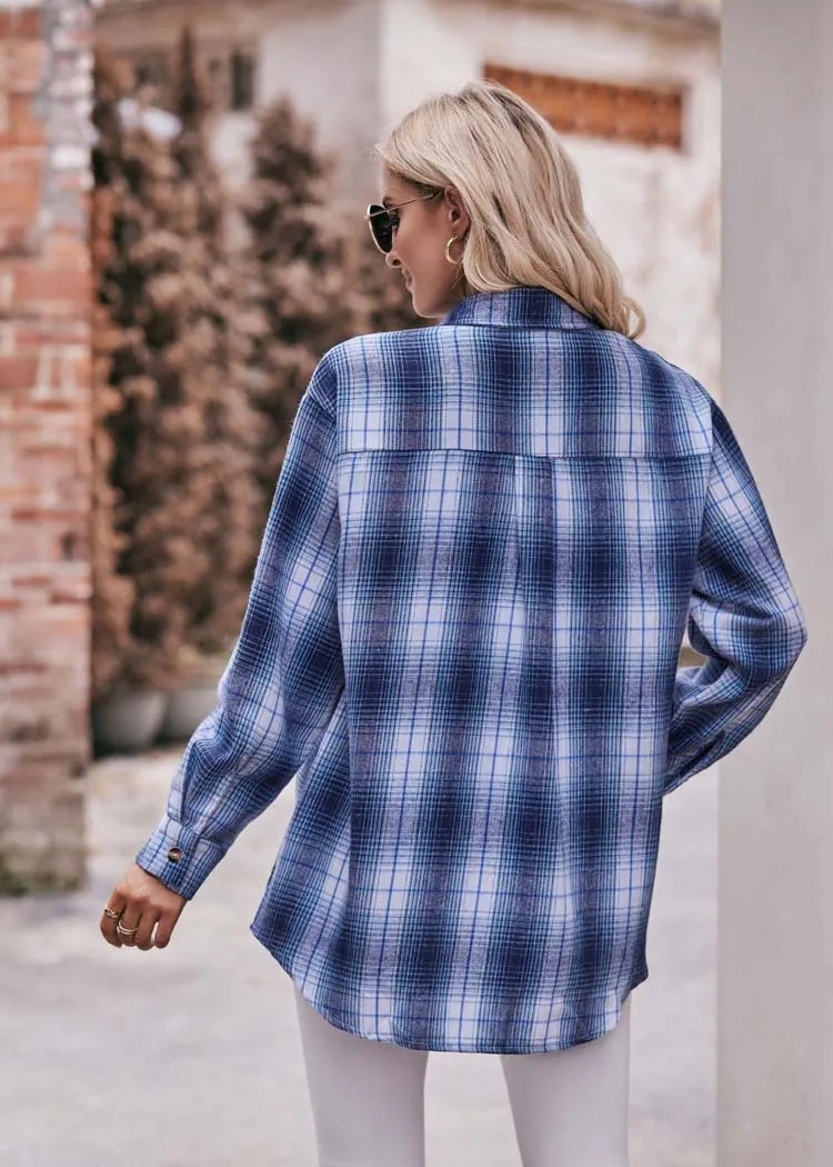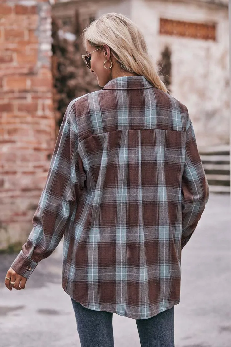 Women Plaid Loose Button Up Winter Long Sleeve Blouse Shirt