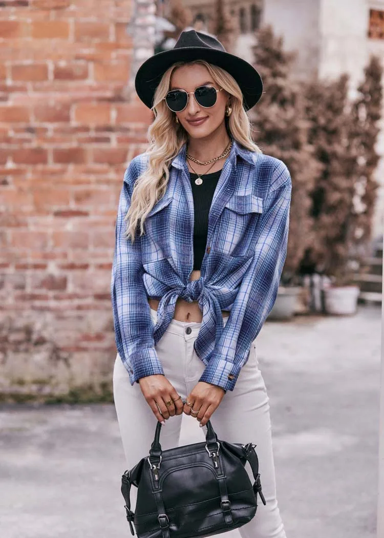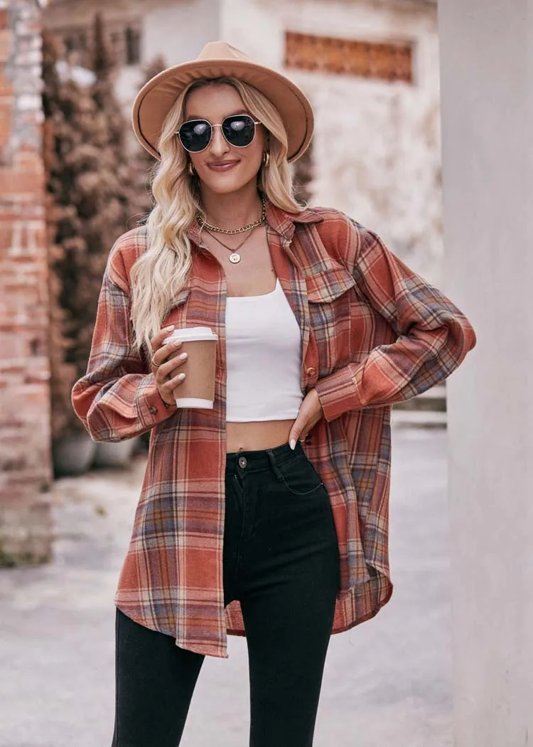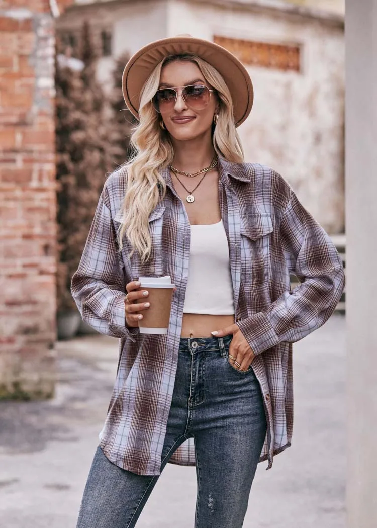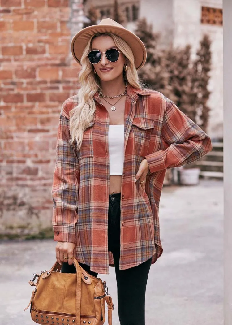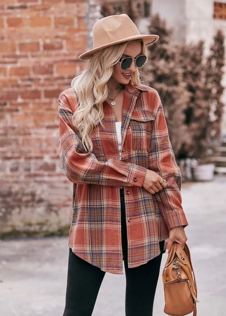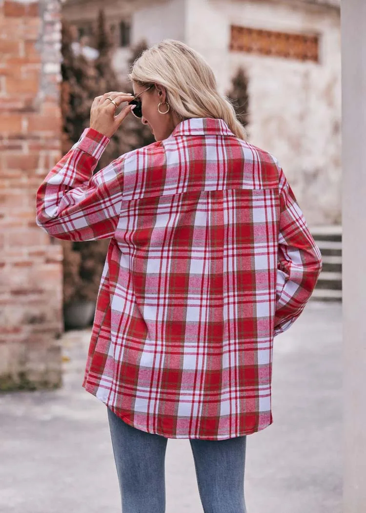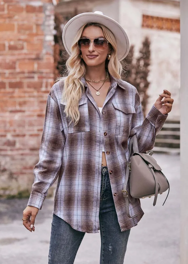 Women Plaid Loose Button Up Winter Long Sleeve Blouse Shirt