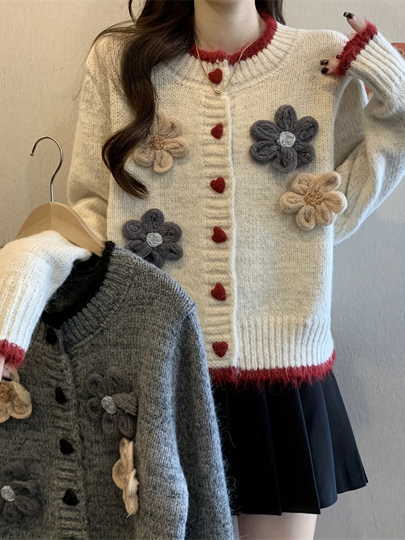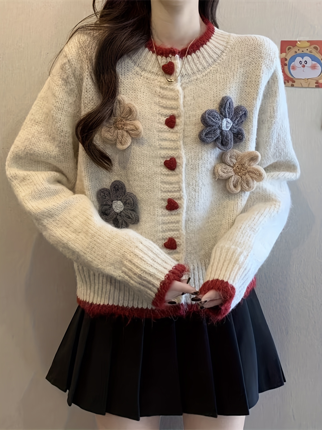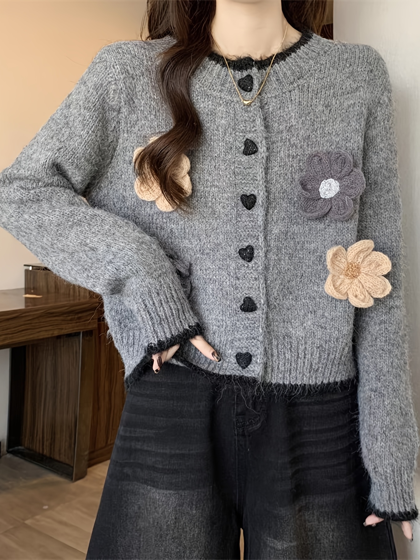 Women'S Round Neck Button Front Casual French-Style Floral Cardigan