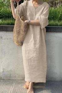Women's Casual Solid Color V Neck Loose Fashion Elegant Loose Midi Dress
