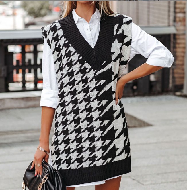Women's Fashion New Houndstooth V-neck Loose Sweater Vests