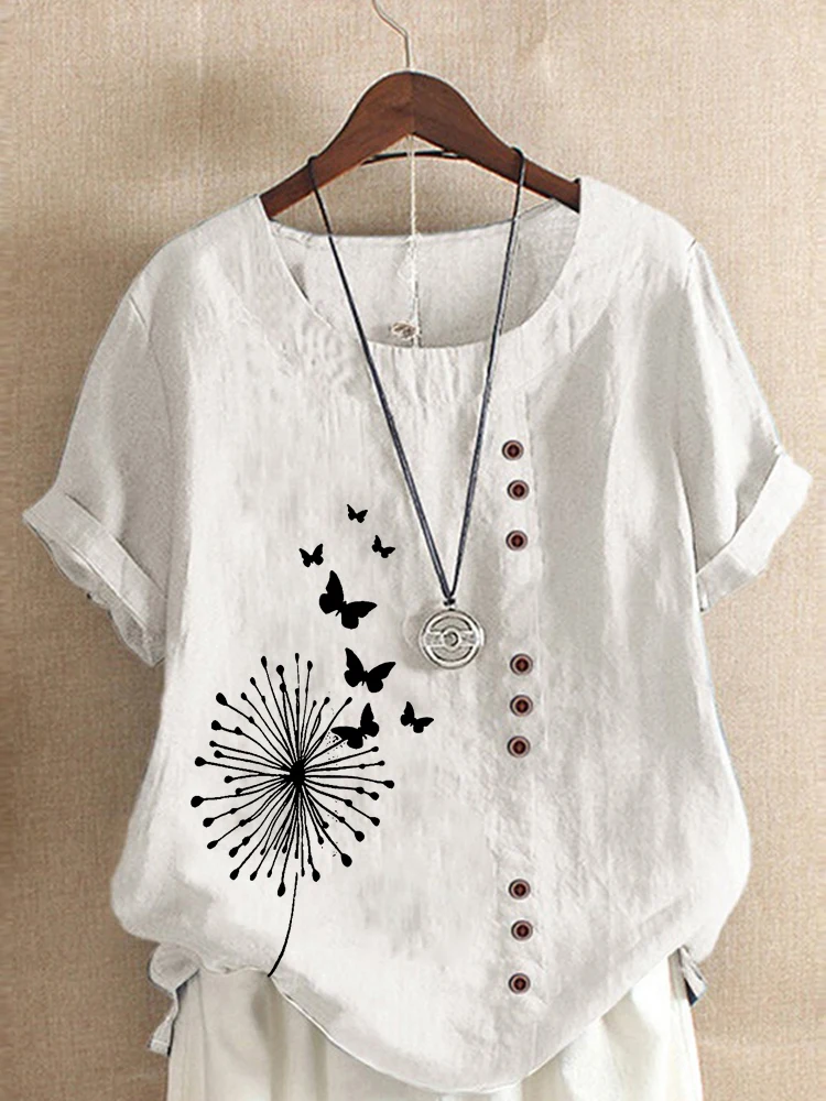 Women 's Summer Dandelion Butterfly Round Neck Blouses