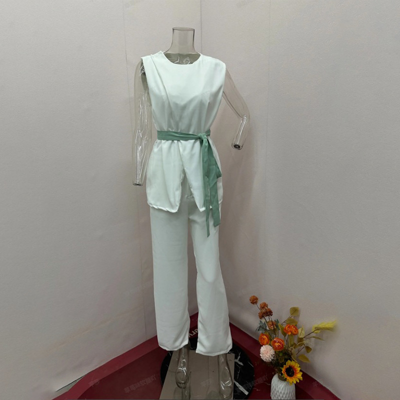 Women's Tops Solid Color Round Neck Sleeveless Belt Pocket Straight Leg Wide Leg Pants Set